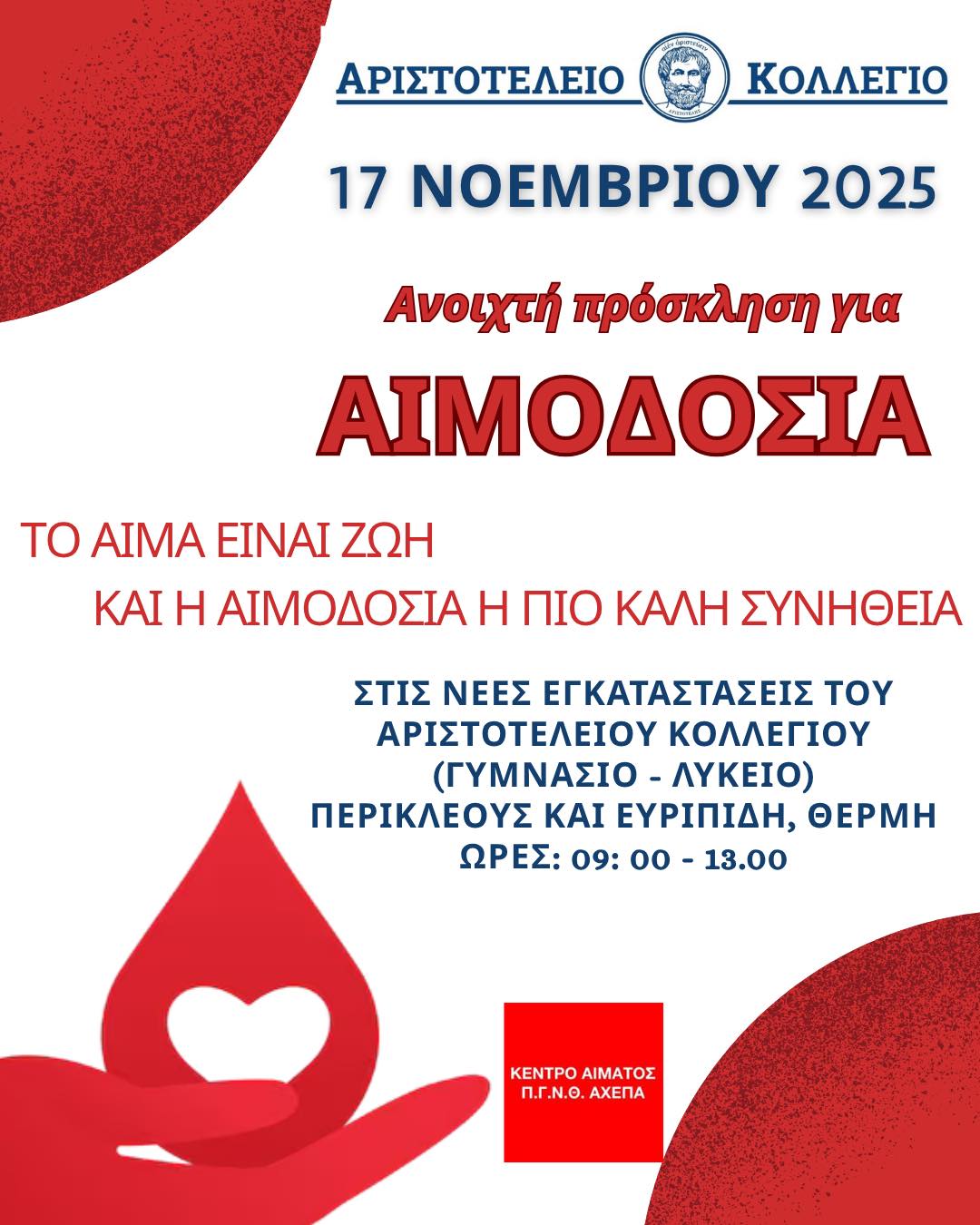 Την Δευτέρα 17 Νοεμβρίου, από τις 09:00 το πρωί έως τις 13:00 το μεσημέρι, σας περιμένουμε στις εγκαταστάσεις Γυμνασίου – Λυκείου του σχολείου μας για να προσφέρετε το πολυτιμότερο δώρο: ζωή.